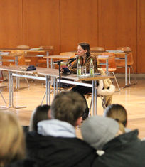 So angelten zum Beispiel unsere Fünftklässler mit Martin Ellrodt im „Meer der Geschichten“, Rolf-Bernhard Essig erklärte die Herkunft und Bedeutung allerlei vielleicht nicht jedem geläufiger Redewendungen aus dem Märchenreich und Sabine Ludwig ließ lesend die bekannte Lehrerin schrumpfen - und erfüllte danach jede Menge Autogrammwünsche der Unterstufe. Ali Djan und Anja Lehmann beeindruckten mit der Vorstellung von Biographien, die von Erlebnissen zwischen Flucht und Integration geprägt sind. Und Monika Martin und Stefanie Mohr nahmen das Publikum mit auf die Suche nach kriminalistischen Spuren in der Region, während Stefanie Baier den Schülerinnen und Schülern „Amalias geheimes Tagebuch“ enthüllte, Aylin Scherzer in „Aurora“ magische Begabungen zum Leben erweckte und Florian Sußner eine phantastischer Abenteuerreise zur den „Feuern des Mondes“ startete…